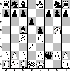 Partie-Notation im PGN-Format [Event "Frohes Fest und spannende Spiele"] [Site "www.mySchach.de"] [Date "2018.12.21"] [Round "1"] [White "Schefsche"] [Black "augustus"] [ECO "C23"] [WhitemyELO "1316"] [BlackmyELO "1072"] [Result "0-1"] [TimeControl "10/864000"] [WhiteDays "05"] [BlackDays "09"] [MySchachNr "113827"] 1. e4 e5 2. Bc4 Qf6 3. d3 Bc5 4. Nh3 d6 5. Ng5 Qxf2# 0-1 Stellungs-Notation im FEN-Format rnb1k1nr/ppp2ppp/3p4/2b1p1N1/2B1P3/3P4/PPP1PqPP/RNBQK2R - KQkq - 0 6 Geschlagene Figuren Weiss: Geschlagene Figuren Schwarz: Klicken Sie auf eine geschlagene Figur um den gewünschten Zug darzustellen!