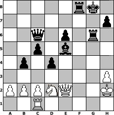 Partie-Notation im PGN-Format [Event "Regensommer"] [Site "www.mySchach.de"] [Date "2012.06.20"] [Round "1"] [White "Duschgel"] [Black "Joschi"] [ECO "A15"] [WhitemyELO "1572"] [BlackmyELO "1601"] [Result "0-1"] [TimeControl "10/1728000"] [WhiteDays "19"] [BlackDays "20"] [MySchachNr "82388"] 1. c4 Nf6 2. g3 c5 3. Bg2 Nc6 4. Nc3 e6 5. e4 d6 6. Nge2 Be7 7. O-O O-O 8. f4 a6 9. d3 Rb8 10. h3 Bd7 11. f5 b5 12. cxb5 axb5 13. g4 b4 14. Nb1 Qb6 15. Kh1 Ne5 16. Ng3 Bb5 17. g5 Nfd7 18. Nh5 Nxd3 19. f6 Bd8 20. Nxg7 Nxc1 21. Qh5 Bxf1 22. Nxe6 Bxg2+ 23. Kxg2 fxe6 24. Qh6 Nxf6 25. gxf6 Rxf6 26. Qxc1 Qc6 27. Qe3 Rg6+ 28. Kh2 Bc7 29. Nd2 d5+ 30. e5 Rf8 31. Rc1 d4 32. Qe2 Bxe5+ 0-1 Stellungs-Notation im FEN-Format 5rk1/7p/2q1p1r1/2p1b3/1p1p4/7P/PPPNQ2K/2R5 - - - 0 33 Geschlagene Figuren Weiss: ![]() ![]() ![]() ![]() ![]() ![]() ![]() ![]() ![]() ![]() ![]() ![]() ![]() ![]() ![]() Geschlagene Figuren Schwarz: ![]() ![]() ![]() ![]() ![]() ![]() ![]() ![]() ![]() ![]() ![]() ![]() ![]() ![]() ![]() Klicken Sie auf eine geschlagene Figur um den gewünschten Zug darzustellen!