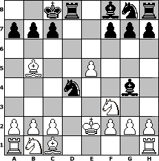 Partie-Notation im PGN-Format [Event "PUNSCH-Turnier"] [Site "www.mySchach.de"] [Date "2010.10.18"] [Round "1"] [White "Joschi"] [Black "pepo47"] [ECO "B01"] [WhitemyELO "1619"] [BlackmyELO "1690"] [Result "0-1"] [TimeControl "10/2592000"] [WhiteDays "29"] [BlackDays "30"] [MySchachNr "69053"] 1. e4 d5 2. exd5 Qxd5 3. d4 e5 4. dxe5 Qxd1+ 5. Kxd1 Nc6 6. Nf3 Bg4 7. Bb5 O-O-O+ 8. Ke2 Nd4+ 0-1 Stellungs-Notation im FEN-Format 2kr1bnr/ppp2ppp/8/1B2P3/3n2b1/5N2/PPP1KPPP/RNB4R - - - 7 9 Geschlagene Figuren Weiss: Geschlagene Figuren Schwarz: Klicken Sie auf eine geschlagene Figur um den gewünschten Zug darzustellen!