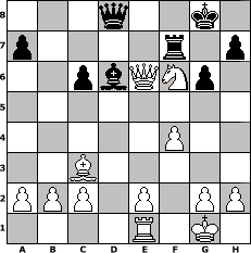 Partie-Notation im PGN-Format [Event "Dabei ist alles 4"] [Site "www.mySchach.de"] [Date "2008.08.25"] [Round "1"] [White "Naunhofer"] [Black "Knight"] [ECO "C42"] [WhitemyELO "1622"] [BlackmyELO "1218"] [Result "1-0"] [TimeControl "10/864000"] [WhiteDays "10"] [BlackDays "10"] [MySchachNr "47487"] 1. e4 e5 2. Nf3 Nf6 3. Nxe5 d6 4. Nf3 Nxe4 5. d4 Bf5 6. Bd3 d5 7. O-O Nc6 8. Re1 Bd6 9. Ng5 Nxd4 10. Bxe4 dxe4 11. Qxd4 O-O 12. Nc3 Re8 13. Qd5 Be6 14. Nxe6 Rxe6 15. Qxb7 f5 16. f4 Rb8 17. Qd5 Qe7 18. Qxf5 Rf8 19. Qg4 e3 20. Nd5 Qe8 21. Bxe3 c6 22. Bd2 Rxe1+ 23. Rxe1 Qd8 24. Bc3 g6 25. Qe6+ Rf7 26. Nf6+ 1-0 Stellungs-Notation im FEN-Format 3q2k1/p4r1p/2pbQNp1/8/5P2/2B5/PPP1P1PP/4R1K1 - - - 3 26 Geschlagene Figuren Weiss: Geschlagene Figuren Schwarz: Klicken Sie auf eine geschlagene Figur um den gewünschten Zug darzustellen!