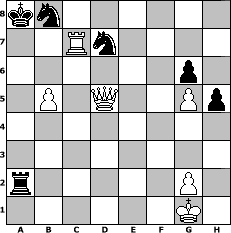 Partie-Notation im PGN-Format [Event "Turnier zum 80.Geburtstag von Viktor Kortschnoi"] [Site "www.mySchach.de"] [Date "2011.03.22"] [Round "1"] [White "kischok46"] [Black "Leeloo"] [ECO "B40"] [WhitemyELO "2025"] [BlackmyELO "1681"] [Result "1-0"] [TimeControl "10/2592000"] [WhiteDays "138"] [BlackDays "096"] [MySchachNr "73002"] 1. e4 c5 2. Nf3 e6 3. Nc3 a6 4. d4 cxd4 5. Nxd4 b5 6. Bd3 Qb6 7. Nf3 Nc6 8. e5 Qb8 9. O-O Nge7 10. Re1 Ng6 11. Be4 Bb7 12. h4 d6 13. exd6 Qxd6 14. Qe2 Be7 15. Rd1 Qc5 16. Be3 Qh5 17. Bg5 Bxg5 18. hxg5 Rc8 19. Rd7 Ba8 20. Rxf7 Kxf7 21. Ne5+ Ncxe5 22. Qxh5 Bxe4 23. Nxe4 Rxc2 24. Qd1 Rc7 25. f4 Nd7 26. f5 exf5 27. Qd5+ Ke7 28. Nd6 Nge5 29. Nxf5+ Kd8 30. Qa8+ Rc8 31. Qxa6 g6 32. Qa5+ Ke8 33. Nd6+ Ke7 34. Nxc8+ Rxc8 35. Qxb5 Rc5 36. Qb3 Kd6 37. Rd1+ Kc7 38. a4 Rc6 39. a5 Nb8 40. Qe3 Ned7 41. b4 Ra6 42. b5 Rxa5 43. Qf4+ Kb7 44. Rc1 Ra2 45. Qd6 h5 46. Rc7+ Ka8 47. Qd5+ 1-0 Stellungs-Notation im FEN-Format kn6/2Rn4/6p1/1P1Q2Pp/8/8/r5P1/6K1 - - - 3 47 Geschlagene Figuren Weiss: Geschlagene Figuren Schwarz: Klicken Sie auf eine geschlagene Figur um den gewünschten Zug darzustellen!