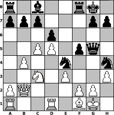 Partie-Notation im PGN-Format [Event "HIGHLAND QUEEN II 2014"] [Site "www.mySchach.de"] [Date "2014.02.11"] [Round "1"] [White "ClaudiaN"] [Black "Erich"] [ECO "A46"] [WhitemyELO "1998"] [BlackmyELO "2044"] [Result "0-1"] [TimeControl "10/2592000"] [WhiteDays "30"] [BlackDays "30"] [MySchachNr "92859"] 1. d4 Nf6 2. Nf3 e6 3. c4 Bb4+ 4. Bd2 Bxd2+ 5. Qxd2 O-O 6. Nc3 d6 7. h3 Nc6 8. e3 e5 9. d5 Ne7 10. Bd3 Nd7 11. O-O f5 12. b4 Ng6 13. Be2 Nf6 14. Qb2 Qe7 15. c5 e4 16. Rfd1 exf3 17. Bxf3 Nh4 18. Be2 Ne4 19. Bf1 Qg5 0-1 Stellungs-Notation im FEN-Format r1b2rk1/ppp3pp/3p4/2PP1pq1/1P2n2n/2N1P2P/PQ3PP1/R2R1BK1 - - - 5 20 Geschlagene Figuren Weiss: Geschlagene Figuren Schwarz: Klicken Sie auf eine geschlagene Figur um den gewünschten Zug darzustellen!