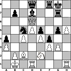 Partie-Notation im PGN-Format [Event "°°°]^^[-Wilkommen im Jahr 2009-]^^[°°°"] [Site "www.mySchach.de"] [Date "2009.01.03"] [Round "1"] [White "murphy12"] [Black "frankto"] [ECO "E61"] [WhitemyELO "1650"] [BlackmyELO "1514"] [Result "1-0"] [TimeControl "10/864000"] [WhiteDays "30"] [BlackDays "30"] [MySchachNr "51329"] 1. d4 Nf6 2. c4 g6 3. Nc3 d6 4. e4 Bg7 5. f3 O-O 6. Be3 e5 7. d5 Nh5 8. Qd2 f5 9. O-O-O f4 10. Bf2 Bf6 11. Kb1 Bh4 12. Bd3 Bxf2 13. Qxf2 a5 14. Nge2 Na6 15. a3 Nc5 16. Bc2 a4 17. Nb5 Nf6 18. Qh4 Bd7 19. Qg5 Rf7 20. h4 Rg7 21. Nxc7 Qxc7 22. Qxf6 h6 23. h5 g5 24. Qxh6 Rf8 25. g3 Qd8 26. Qxd6 1-0 Stellungs-Notation im FEN-Format 3q1rk1/1p1b2r1/3Q4/2nPp1pP/p1P1Pp2/P4PP1/1PB1N3/1K1R3R - - - 0 26 Geschlagene Figuren Weiss: ![]() ![]() ![]() ![]() ![]() ![]() ![]() ![]() ![]() ![]() ![]() ![]() ![]() ![]() ![]() Geschlagene Figuren Schwarz: ![]() ![]() ![]() ![]() ![]() ![]() ![]() ![]() ![]() ![]() ![]() ![]() ![]() ![]() ![]() Klicken Sie auf eine geschlagene Figur um den gewünschten Zug darzustellen!