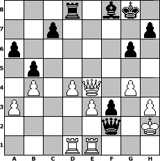 Partie-Notation im PGN-Format [Event "Open"] [Site "www.mySchach.de"] [Date "2016.01.17"] [Round "1"] [White "Naunhofer"] [Black "miu"] [ECO "E61"] [WhitemyELO "1695"] [BlackmyELO "1635"] [Result "0-1"] [TimeControl "10/1728000"] [WhiteDays "100"] [BlackDays "091"] [MySchachNr "102139"] 1. d4 Nf6 2. c4 g6 3. Nc3 Bg7 4. Nf3 O-O 5. e3 d5 6. Bd3 Bg4 7. O-O Re8 8. b4 dxc4 9. Bxc4 Nc6 10. a3 a6 11. Be2 e6 12. Bb2 Ne7 13. Ne5 Bxe2 14. Nxe2 Ned5 15. Qb3 Ne4 16. Qd3 f5 17. Nc4 Bh6 18. Nd2 Nxd2 19. Qxd2 Nf6 20. Rac1 Qd6 21. Qc3 Nd5 22. Qb3 b5 23. Rc2 Nb6 24. Rfc1 Nc4 25. Rd1 Rad8 26. Nc1 e5 27. Rcd2 Kf8 28. Re2 Qd7 29. Ree1 Nxb2 30. Qxb2 f4 31. h3 f3 32. g4 e4 33. Nb3 Qe7 34. Kh2 Qd6+ 35. Kg1 Kg8 36. Nc5 Bf8 37. Qb1 Qf6 38. Nxe4 Qh4 39. Kh2 Rxe4 40. Qxe4 Qxf2+ 0-1 Stellungs-Notation im FEN-Format 3r1bk1/2p4p/p5p1/1p6/1P1PQ1P1/P3Pp1P/5q1K/3RR3 - - - 0 41 Geschlagene Figuren Weiss: Geschlagene Figuren Schwarz: Klicken Sie auf eine geschlagene Figur um den gewünschten Zug darzustellen!