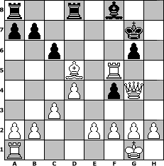 Partie-Notation im PGN-Format [Event "Osterei 2015"] [Site "www.mySchach.de"] [Date "2015.04.05"] [Round "1"] [White "kalle"] [Black "lotchi"] [ECO "C50"] [WhitemyELO "1612"] [BlackmyELO "1204"] [Result "1-0"] [TimeControl "10/2592000"] [WhiteDays "73"] [BlackDays "60"] [MySchachNr "98856"] 1. e4 e5 2. Nf3 Nc6 3. Bc4 h6 4. O-O Nf6 5. d4 d5 6. exd5 Nxd5 7. Re1 Bb4 8. c3 Be7 9. Nxe5 Nxe5 10. Rxe5 c6 11. Nd2 g6 12. Nf3 O-O 13. Bxh6 Re8 14. Qd2 f6 15. Qd3 Kh7 16. Nh4 f5 17. Qh3 f4 18. Nf5 Bf8 19. Bg5+ Kg8 20. Bxd8 Rxd8 21. Qg4 Bxf5 22. Rxf5 Kg7 23. Bxd5 1-0 Stellungs-Notation im FEN-Format r2r1b2/pp4k1/2p3p1/3B1R2/3P1pQ1/2P5/PP2PPPP/R5K1 - - - 0 23 Geschlagene Figuren Weiss: Geschlagene Figuren Schwarz: Klicken Sie auf eine geschlagene Figur um den gewünschten Zug darzustellen!