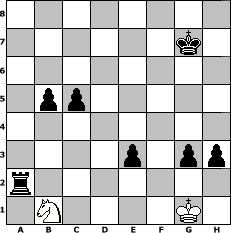 Partie-Notation im PGN-Format [Event "m"] [Site "www.mySchach.de"] [Date "2007.02.22"] [Round "1"] [White "alpacino"] [Black "UPS"] [ECO "A00"] [WhitemyELO "1210"] [BlackmyELO "1732"] [Result "0-1"] [TimeControl "10/864000"] [WhiteDays "44"] [BlackDays "33"] [MySchachNr "32747"] 1. Nc3 d5 2. d4 e6 3. e3 Nf6 4. Nf3 Bb4 5. Bd2 O-O 6. Bd3 Nc6 7. Ng5 h6 8. Nf3 a6 9. O-O Bd7 10. Ne5 Nxe5 11. dxe5 Nh7 12. Ne2 Bxd2 13. Qxd2 c5 14. Bxh7+ Kxh7 15. Qd3+ Kg8 16. Nf4 Bb5 17. Qd1 Bxf1 18. Kxf1 Qc7 19. Nh5 Qxe5 20. c3 Qxh2 21. Ng3 g6 22. Ke2 Qxg2 23. Qf1 Qxf1+ 24. Rxf1 f5 25. Rh1 Kg7 26. b3 b5 27. f3 a5 28. e4 a4 29. Kd2 fxe4 30. fxe4 axb3 31. axb3 Rf3 32. exd5 Ra2+ 33. Ke1 Rxg3 34. Rf1 exd5 35. Kd1 Rxc3 36. Rf4 Rxb3 37. Kc1 d4 38. Re4 Re3 39. Rxe3 dxe3 40. Kd1 g5 41. Ke1 g4 42. Kf1 g3 43. Kg1 h5 44. Kf1 h4 45. Kg1 h3 0-1 Stellungs-Notation im FEN-Format 8/6k1/8/1pp5/8/4p1pp/r7/1N4K1 - - - 0 46 Geschlagene Figuren Weiss: Geschlagene Figuren Schwarz: Klicken Sie auf eine geschlagene Figur um den gewünschten Zug darzustellen!
