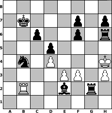 Partie-Notation im PGN-Format [Event "Opera "] [Site "www.mySchach.de"] [Date "2025.09.04"] [Round "1"] [White "Achimkogge"] [Black "skuehnel"] [ECO "D00"] [WhitemyELO "1216"] [BlackmyELO "1361"] [Result "0-1"] [TimeControl "10/2592000"] [WhiteDays "147"] [BlackDays "126"] [MySchachNr "133642"] 1. d4 d5 2. c3 Nf6 3. f3 Bf5 4. Qa4+ Nc6 5. Bf4 Qd7 6. Nd2 O-O-O 7. b4 Nb8 8. Qxa7 e6 9. e3 Bd6 10. Bg5 Be7 11. Nb3 Qc6 12. Rc1 b6 13. b5 Qb7 14. Qxb7+ Kxb7 15. a4 Ba3 16. Rd1 Bc2 17. Rd2 Bxb3 18. a5 bxa5 19. Bd3 Bc1 20. Re2 a4 21. Nh3 a3 22. Bb1 Bb2 23. Kf2 Bxc3 24. Nf4 Bc4 25. Rc2 Bb2 26. h3 Bxb5 27. Ba2 Na6 28. Rb1 Nb4 29. Bxd5+ exd5 30. Rc5 c6 31. Kg3 a2 32. Rd1 Ra8 33. Bh4 a1=Q 34. Rxa1 Rxa1 35. Bxf6 gxf6 36. Kg4 Rg8+ 37. Kh4 Bc1 38. Ne2 Bxe2 39. Rc3 Bd2 40. Rb3 Rg1 41. Rb2 R1xg2 42. Rxd2 R8g6 43. Rb2 Rh6# 0-1 Stellungs-Notation im FEN-Format 8/1k3p1p/2p2p1r/3p4/1n1P3K/4PP1P/1R2b1r1/8 - - - 3 44 Geschlagene Figuren Weiss: Geschlagene Figuren Schwarz: Klicken Sie auf eine geschlagene Figur um den gewünschten Zug darzustellen!