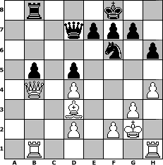 Partie-Notation im PGN-Format [Event "3.FC 960-Clubmeisterschaft 2014"] [Site "www.mySchach.de"] [Date "2014.01.10"] [Round "1"] [White "nyffhans"] [Black "Schachfedi"] [Variant "Fischerrandom"] [SetUp "1"] [FEN "qbbnnrkr/pppppppp/8/8/8/8/PPPPPPPP/QBBNNRKR w KQkq - 0 1"] [WhitemyELO "2055"] [BlackmyELO "1816"] [Result "1-0"] [TimeControl "10/2592000"] [WhiteDays "30"] [BlackDays "29"] [MySchachNr "92270"] 1. d4 d5 2. b3 Nf6 3. Nf3 c6 4. Ba3 Re8 5. h4 Ne6 6. Ne3 Nf4 7. Re1 O-O 8. c4 dxc4 9. g3 N4d5 10. Nxc4 Bg4 11. Ng5 h6 12. e4 b5 13. Ne5 Bd6 14. exd5 Bxa3 15. Qc3 cxd5 16. b4 Bxb4 17. Qxb4 Qb7 18. Nxg4 Nxg4 19. Nh7 Nf6 20. Nxf8 Kxf8 21. Bd3 a6 22. a4 Rb8 23. axb5 axb5 24. Kg2 Qd7 25. Rb1 1-0 Stellungs-Notation im FEN-Format 1r3k2/3qppp1/5n1p/1p1p4/1Q1P3P/3B2P1/3P1PK1/1R5R - - - 3 25 Geschlagene Figuren Weiss: Geschlagene Figuren Schwarz: Klicken Sie auf eine geschlagene Figur um den gewünschten Zug darzustellen!