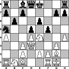 Partie-Notation im PGN-Format [Event "Godzilla Mannschaftsturnier 2013"] [Site "www.mySchach.de"] [Date "2013.08.15"] [Round "1"] [Board "4"] [White "Schachfedi"] [Black "Verena"] [ECO "A00"] [WhitemyELO "1756"] [BlackmyELO "1486"] [Result "1-0"] [TimeControl "10/3456000"] [WhiteDays "29"] [BlackDays "39"] [MySchachNr "89739"] 1. Nc3 Nc6 2. d4 d5 3. g3 e6 4. Bg2 Nf6 5. Nf3 Bb4 6. O-O Bxc3 7. bxc3 Ne4 8. Qd3 Na5 9. a4 b6 10. h4 f6 11. Nfd2 f5 12. Nxe4 1-0 Stellungs-Notation im FEN-Format r1bqk2r/p1p3pp/1p2p3/n2p1p2/P2PN2P/2PQ2P1/2P1PPB1/RNB2RK1 - kq - 0 12 Geschlagene Figuren Weiss: Geschlagene Figuren Schwarz: Klicken Sie auf eine geschlagene Figur um den gewünschten Zug darzustellen!