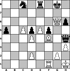 Partie-Notation im PGN-Format [Event "?"] [Site "www.mySchach.de"] [Date "2025.09.15"] [Round "?"] [White "Winston"] [Black "faustballer"] [Variant "Fischerrandom"] [SetUp "1"] [FEN "rbnnqkbr/pppppppp/8/8/8/8/PPPPPPPP/RBNNQKBR w KQkq - 0 1"] [WhitemyELO "1500"] [BlackmyELO "1466"] [Result "1-0"] [TimeControl "10/2592000"] [WhiteDays "120"] [BlackDays "115"] [MySchachNr "133651"] 1. d4 c6 2. c4 f6 3. c5 b6 4. b4 bxc5 5. bxc5 h6 6. Bd3 Bc7 7. Rb1 Bf7 8. e3 Bg6 9. Nb2 Bxd3+ 10. Ncxd3 Qh5 11. h3 Ne6 12. f4 a5 13. a4 O-O 14. Nf2 Qg6 15. Nbd3 d6 16. Rc1 d5 17. Bh2 Ra7 18. Qe2 Qh7 19. O-O Rb7 20. Rb1 Rxb1 21. Rxb1 Nd8 22. Qg4 f5 23. Qd1 Ne6 24. Ne5 Bxe5 25. fxe5 g6 26. Qb3 Ng5 27. Qb7 e6 28. Qxc6 Qf7 29. Nd3 Qe8 30. Qa6 Qxa4 31. Nf4 Qa2 32. Rf1 Qa3 33. Nxe6 Re8 34. Nxg5 Qxe3+ 35. Kh1 Qxg5 36. Bf4 Qh4 37. Qxg6+ 1-0 Stellungs-Notation im FEN-Format 2n1r1k1/8/6Qp/p1PpPp2/3P1B1q/7P/3P2P1/5R1K - - - 0 37 Geschlagene Figuren Weiss: Geschlagene Figuren Schwarz: Klicken Sie auf eine geschlagene Figur um den gewünschten Zug darzustellen!