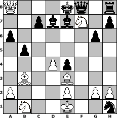Partie-Notation im PGN-Format [Event "Sweety Tunier"] [Site "www.mySchach.de"] [Date "2006.02.28"] [Round "2"] [White "carlo"] [Black "Falcor"] [ECO "C23"] [WhitemyELO "1046"] [BlackmyELO "1422"] [Result "1-0"] [TimeControl "10/2592000"] [WhiteDays "82"] [BlackDays "74"] [MySchachNr "23046"] 1. e4 e5 2. Bc4 Nc6 3. Qf3 Nf6 4. d3 Nd4 5. Qg3 Nxc2+ 6. Kd1 Nxa1 7. Qxe5+ Be7 8. b3 Nxb3 9. Bxb3 d6 10. Qg5 g6 11. e5 Ng4 12. Qf4 dxe5 13. Qxf7+ Kd7 14. Qc4 Nxf2+ 15. Ke1 Qf8 16. d4 Nxh1 17. Nf3 e4 18. Ne5+ Ke8 19. Be3 a6 20. Nf7 b5 21. Qc6+ Bd7 22. Qxa8+ 1-0 Stellungs-Notation im FEN-Format Q3kq1r/2pbbN1p/p5p1/1p6/3Pp3/1B2B3/P3P1PP/1N2K2n - - - 0 22 Geschlagene Figuren Weiss: Geschlagene Figuren Schwarz: Klicken Sie auf eine geschlagene Figur um den gewünschten Zug darzustellen!