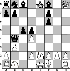 Partie-Notation im PGN-Format [Event "Weihnachts-Turnier 2006"] [Site "www.mySchach.de"] [Date "2006.12.24"] [Round "1"] [White "PublicEnemy"] [Black "Mirikado23"] [ECO "A40"] [WhitemyELO "1401"] [BlackmyELO "1322"] [Result "0-1"] [TimeControl "10/864000"] [WhiteDays "00"] [BlackDays "04"] [MySchachNr "31061"] 1. d4 e6 2. e4 Nf6 3. Bg5 d5 4. e5 Bb4+ 5. c3 Be7 6. exf6 gxf6 7. Bh6 e5 8. Qh5 c6 9. Bg7 Rg8 10. Qxh7 Qb6 11. b3 Rf8 12. Bxf8 Bxf8 13. Qh8 exd4 14. Ne2 c5 15. cxd4 Qb4+ 0-1 Stellungs-Notation im FEN-Format rnb1kb1Q/pp3p2/5p2/2pp4/1q1P4/1P6/P2PNPPP/RN2KB1R - KQq - 1 16 Geschlagene Figuren Weiss: ![]() ![]() ![]() ![]() ![]() ![]() ![]() ![]() ![]() ![]() ![]() ![]() ![]() ![]() ![]() Geschlagene Figuren Schwarz: ![]() ![]() ![]() ![]() ![]() ![]() ![]() ![]() ![]() ![]() ![]() ![]() ![]() ![]() ![]() Klicken Sie auf eine geschlagene Figur um den gewünschten Zug darzustellen!