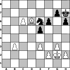 | Partie-Notation im PGN-Format [Event "Lied der Nibelungen"] [Site "www.mySchach.de"] [Date "2021.06.18"] [Round "2"] [White "Seneca"] [Black "Mynona"] [ECO "D00"] [WhitemyELO "1472"] [BlackmyELO "1323"] [Result "1-0"] [TimeControl "10/2592000"] [WhiteDays "138"] [BlackDays "142"] [MySchachNr "122468"] 1. d4 d5 2. e3 Bf5 3. c4 dxc4 4. Bxc4 a6 5. Nf3 e6 6. O-O b5 7. Bb3 a5 8. a3 a4 9. Ba2 c5 10. Nc3 b4 11. axb4 cxb4 12. Nxa4 Nf6 13. b3 Nd5 14. Bb2 Be7 15. Bb1 Bxb1 16. Rxb1 O-O 17. Rc1 Nd7 18. Nc5 Bxc5 19. dxc5 Qe7 20. c6 N7b6 21. Nd4 Rfd8 22. Qe2 Ra7 23. g3 Ra2 24. Rc2 f6 25. Ra1 Rxa1+ 26. Bxa1 Ra8 27. Bb2 e5 28. Nf3 Nc7 29. Nd2 Qe6 30. Qd3 Ra6 31. Ne4 Ra5 32. Kg2 Rd5 33. Qe2 Qe7 34. Rd2 h6 35. Rxd5 Nbxd5 36. Qc4 Kh7 37. Bc1 Qe6 38. Bd2 Nb6 39. Qxe6 Nxe6 40. Bxb4 Nc8 41. Nd6 Nxd6 42. Bxd6 1-0 Stellungs-Notation im FEN-Format 8/6pk/2PBnp1p/4p3/8/1P2P1P1/5PKP/8 - - - 0 42 Geschlagene Figuren Weiss:                              Geschlagene Figuren Schwarz:                               Klicken Sie auf eine geschlagene Figur um den gewünschten Zug darzustellen!