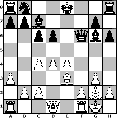 Partie-Notation im PGN-Format [Event "Im Winter 2020"] [Site "www.mySchach.de"] [Date "2020.01.29"] [Round "2"] [White "Robert"] [Black "Geisterreiter"] [ECO "A21"] [WhitemyELO "1668"] [BlackmyELO "1287"] [Result "1-0"] [TimeControl "10/1728000"] [WhiteDays "18"] [BlackDays "09"] [MySchachNr "117163"] 1. c4 e5 2. Nc3 c6 3. Nf3 Bd6 4. g3 h6 5. a3 Nf6 6. Bg2 Qe7 7. O-O Bc7 8. d4 e4 9. Ne5 d6 10. Nxf7 Qxf7 11. Nxe4 Bf5 12. Nxf6+ Qxf6 13. e4 Bg6 14. Be3 1-0 Stellungs-Notation im FEN-Format rn2k2r/ppb3p1/2pp1qbp/8/2PPP3/P3B1P1/1PP2PBP/R2Q1RK1 - kq - 2 14 Geschlagene Figuren Weiss: Geschlagene Figuren Schwarz: Klicken Sie auf eine geschlagene Figur um den gewünschten Zug darzustellen!