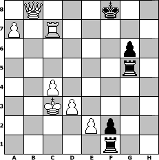 Partie-Notation im PGN-Format [Event "Gunnis Spätsommerturnier"] [Site "www.mySchach.de"] [Date "2018.09.07"] [Round "1"] [White "Haneken"] [Black "borsti"] [ECO "C20"] [WhitemyELO "1067"] [BlackmyELO "1319"] [Result "1-0"] [TimeControl "10/2592000"] [WhiteDays "206"] [BlackDays "181"] [MySchachNr "112997"] 1. e4 e5 2. Bb5 c6 3. Bc4 Nf6 4. d3 b5 5. Bb3 Bc5 6. Bg5 O-O 7. Qf3 d5 8. Nc3 Bb4 9. O-O-O Bg4 10. Bxf6 Qxf6 11. Qxg4 Rd8 12. exd5 c5 13. Nxb5 Nd7 14. a3 Ba5 15. Qa4 Bb6 16. d6 Qf4+ 17. Rd2 Qxa4 18. Bxa4 Nf6 19. Nf3 a6 20. Nc3 Ba5 21. Nxe5 Rxd6 22. Bb3 Ra7 23. Re1 h5 24. Ng6 Kh7 25. Nf8+ Kh8 26. Re5 Rd8 27. Nd5 Bxd2+ 28. Kxd2 Nxd5 29. Rxh5+ Kg8 30. Bxd5 Kxf8 31. Bc4 a5 32. Bb5 Rb7 33. a4 Rc7 34. c3 g6 35. Rh8+ Ke7 36. Rh7 Kf6 37. f4 Rd6 38. c4 Kf5 39. Be8 Kf6 40. g4 Re7 41. g5+ Ke6 42. Bb5 f5 43. Rh6 Kf7 44. Rh7+ Kf8 45. Rh8+ Kg7 46. Ra8 Rd4 47. Rxa5 Rxf4 48. Bc6 Rf2+ 49. Kc3 Rxh2 50. Rxc5 f4 51. b4 Rh3 52. b5 f3 53. b6 f2 54. Bg2 Rh2 55. Bf1 Re1 56. b7 Rb1 57. Rc7+ Kf8 58. a5 Rh5 59. a6 Rxg5 60. a7 Rxf1 61. b8=Q# 1-0 Stellungs-Notation im FEN-Format 1Q3k2/P1R5/6p1/6r1/2P5/2KP4/4Pp2/5r2 - - - 0 61 Geschlagene Figuren Weiss: Geschlagene Figuren Schwarz: Klicken Sie auf eine geschlagene Figur um den gewünschten Zug darzustellen!