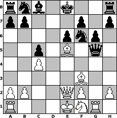 Partie-Notation im PGN-Format [Event "Goldener Bauer 2008-2009"] [Site "www.mySchach.de"] [Date "2008.11.02"] [Round "1"] [White "Peterlie77 (C)"] [Black "wilfried"] [ECO "D31"] [WhitemyELO "1619"] [BlackmyELO "1632"] [Result "1-0"] [TimeControl "10/2592000"] [WhiteDays "56"] [BlackDays "58"] [MySchachNr "49491"] 1. d4 d5 2. c4 e6 3. Nc3 c6 4. e4 dxe4 5. Nxe4 Bb4+ 6. Bd2 Qxd4 7. Bxb4 Qxe4+ 8. Be2 Qxg2 9. Bf3 Qg5 10. Ne2 c5 11. Bc3 Nf6 12. Rg1 Qf5 13. Ng3 Qf4 14. Qe2 g6 15. Be5 Qg5 16. Nf1 1-0 Stellungs-Notation im FEN-Format rnb1k2r/pp3p1p/4pnp1/2p1B1q1/2P5/5B2/PP2QP1P/R3KNR1 - Qkq - 3 16 Geschlagene Figuren Weiss: Geschlagene Figuren Schwarz: Klicken Sie auf eine geschlagene Figur um den gewünschten Zug darzustellen!