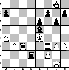 Partie-Notation im PGN-Format [Event "Jugend tunier"] [Site "www.mySchach.de"] [Date "2005.09.09"] [Round "1"] [White "Caligula"] [Black "Joschi"] [ECO "A48"] [WhitemyELO "1459"] [BlackmyELO "1690"] [Result "0-1"] [TimeControl "10/2592000"] [WhiteDays "80"] [BlackDays "80"] [MySchachNr "17157"] 1. d4 Nf6 2. Nf3 g6 3. c4 c5 4. Nc3 cxd4 5. Nxd4 Bg7 6. e3 d6 7. Be2 O-O 8. O-O Nc6 9. Nxc6 bxc6 10. h3 Be6 11. b3 Ne4 12. Bb2 Nxc3 13. Bxc3 Bxc3 14. Rb1 Bf5 15. Rc1 Bb2 16. Rc2 Bxc2 17. Qxc2 Bg7 18. Bf3 d5 19. Rd1 e6 20. cxd5 cxd5 21. e4 Rc8 22. Qd3 dxe4 23. Bxe4 Qxd3 24. Rxd3 Rfd8 25. Rf3 Rd2 26. a4 Be5 27. g3 Rc3 0-1 Stellungs-Notation im FEN-Format 6k1/p4p1p/4p1p1/4b3/P3B3/1Pr2RPP/3r1P2/6K1 - - - 1 28 Geschlagene Figuren Weiss: Geschlagene Figuren Schwarz: Klicken Sie auf eine geschlagene Figur um den gewünschten Zug darzustellen!