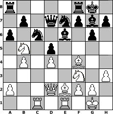 Partie-Notation im PGN-Format [Event "LCC Sommer Mannschaftsturnier 2016"] [Site "www.mySchach.de"] [Date "2016.07.29"] [Round "1"] [Board "1"] [White "Holzhacker"] [Black "larlinde"] [ECO "A04"] [WhitemyELO "2103"] [BlackmyELO "2153"] [Result "0-1"] [TimeControl "10/2592000"] [WhiteDays "00"] [BlackDays "15"] [MySchachNr "104348"] 1. Nf3 c5 2. c4 Nc6 3. Nc3 g6 4. e3 Bg7 5. d4 d6 6. Be2 e6 7. O-O cxd4 8. exd4 d5 9. cxd5 exd5 10. Bg5 Nge7 11. Qd2 O-O 12. h3 Qd6 13. Rac1 Be6 14. Rfe1 Rfe8 15. Nb5 Qd7 16. Bf4 Rf8 17. b4 a6 0-1 Stellungs-Notation im FEN-Format r4rk1/1p1qnpbp/p1n1b1p1/1N1p4/1P1P1B2/5N1P/P2QBPP1/2R1R1K1 - - - 0 18 Geschlagene Figuren Weiss: Geschlagene Figuren Schwarz: Klicken Sie auf eine geschlagene Figur um den gewünschten Zug darzustellen!