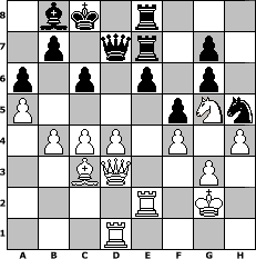Partie-Notation im PGN-Format [Event "Sommer 2010"] [Site "www.mySchach.de"] [Date "2010.06.15"] [Round "1"] [White "UPS"] [Black "leitsgeheier"] [ECO "B01"] [WhitemyELO "1676"] [BlackmyELO "1639"] [Result "1/2-1/2"] [TimeControl "10/1728000"] [WhiteDays "35"] [BlackDays "14"] [MySchachNr "66330"] 1. e4 d5 2. exd5 Qxd5 3. Nf3 Nf6 4. Nc3 Qa5 5. Be2 Bf5 6. d4 c6 7. Bd2 Nbd7 8. O-O e6 9. a3 Bd6 10. Nh4 Bg6 11. Nxg6 hxg6 12. g3 O-O-O 13. Ne4 Qc7 14. Ng5 Nb6 15. c3 Nh5 16. Kg2 Nd5 17. Bg4 Rde8 18. b4 f5 19. Bxh5 Rxh5 20. f4 Reh8 21. h4 Qd7 22. Rh1 Re8 23. Qf3 Nf6 24. Rae1 Rhh8 25. c4 Bc7 26. Bc3 Re7 27. a4 Rhe8 28. Re2 a6 29. Rhe1 Bb8 30. Qd3 Nh5 31. Qf3 Ba7 32. a5 Nf6 33. Qd3 Bb8 34. Rd1 Nh5 1/2-1/2 Stellungs-Notation im FEN-Format 1bk1r3/1p1qr1p1/p1p1p1p1/P4pNn/1PPP1P1P/2BQ2P1/4R1K1/3R4 - - - 5 35 Geschlagene Figuren Weiss: ![]() ![]() ![]() ![]() ![]() ![]() ![]() ![]() ![]() ![]() ![]() ![]() ![]() ![]() ![]() Geschlagene Figuren Schwarz: ![]() ![]() ![]() ![]() ![]() ![]() ![]() ![]() ![]() ![]() ![]() ![]() ![]() ![]() ![]() Klicken Sie auf eine geschlagene Figur um den gewünschten Zug darzustellen!