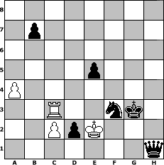 Partie-Notation im PGN-Format [Event "Vorweihnachtsturnier"] [Site "www.mySchach.de"] [Date "2010.11.23"] [Round "2"] [White "Lohl"] [Black "haggard"] [ECO "A04"] [WhitemyELO "1798"] [BlackmyELO "1845"] [Result "0-1"] [TimeControl "10/3456000"] [WhiteDays "261"] [BlackDays "280"] [MySchachNr "70032"] 1. Nf3 f5 2. e4 fxe4 3. Ng5 Nf6 4. d3 Nc6 5. Nc3 d5 6. dxe4 d4 7. Nce2 e5 8. Ng3 Bb4+ 9. Bd2 Qe7 10. Bb5 Bxd2+ 11. Qxd2 O-O 12. O-O h6 13. Nf3 Bg4 14. Nh4 Qc5 15. Bxc6 Qxc6 16. f3 Bd7 17. a4 Rad8 18. Ng6 Rfe8 19. Nh4 Be6 20. Rfd1 Qb6 21. Qd3 a5 22. b3 Nd7 23. Rd2 Kh7 24. Qb5 Rf8 25. Qxb6 Nxb6 26. Re1 c5 27. Rb1 Rd7 28. h3 c4 29. Kf2 c3 30. Re2 Rc8 31. Ree1 d3 32. Rec1 d2 33. Rd1 g6 34. Nf1 Rf8 35. Ne3 Nc8 36. g4 h5 37. gxh5 gxh5 38. Rg1 Rg7 39. Rxg7+ Kxg7 40. Nhf5+ Bxf5 41. Nxf5+ Rxf5 42. exf5 Ne7 43. Ke3 Nd5+ 44. Ke4 Nf4 45. h4 Kf6 46. Ra1 Nh3 47. Ke3 Kxf5 48. f4 Nxf4 49. Rf1 Kg4 50. Rh1 Kg3 51. Rg1+ Kxh4 52. Rf1 Kg3 53. Rg1+ Ng2+ 54. Ke2 h4 55. Rb1 Ne1 56. b4 h3 57. Rb3 axb4 58. Rxb4 h2 59. Rc4 h1=Q 60. Rxc3+ Nf3 0-1 Stellungs-Notation im FEN-Format 8/1p6/8/4p3/P7/2R2nk1/2PpK3/7q - - - 1 61 Geschlagene Figuren Weiss: Geschlagene Figuren Schwarz: Klicken Sie auf eine geschlagene Figur um den gewünschten Zug darzustellen!