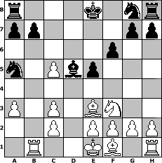 Partie-Notation im PGN-Format [Event "Schach zur Fussball WM"] [Site "www.mySchach.de"] [Date "2014.06.12"] [Round "2"] [White "mudb"] [Black "borsti"] [ECO "A21"] [WhitemyELO "1046"] [BlackmyELO "1254"] [Result "0-1"] [TimeControl "10/1728000"] [WhiteDays "00"] [BlackDays "20"] [MySchachNr "94742"] 1. c4 e5 2. Nc3 Bb4 3. a3 Bxc3 4. dxc3 c5 5. Qd5 Qe7 6. Nf3 d6 7. Bg5 f6 8. Be3 Nc6 9. b4 Qe6 10. Qxe6+ Bxe6 11. bxc5 d5 12. cxd5 Bxd5 13. Rb1 Na5 0-1 Stellungs-Notation im FEN-Format r3k1nr/pp4pp/5p2/n1Pbp3/8/P1P1BN2/2P1PPPP/1R2KB1R - Kkq - 2 14 Geschlagene Figuren Weiss: Geschlagene Figuren Schwarz: Klicken Sie auf eine geschlagene Figur um den gewünschten Zug darzustellen!