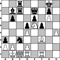 Partie-Notation im PGN-Format [Event "Ryder-Gambit 2"] [Site "www.mySchach.de"] [Date "2011.12.20"] [Round "1"] [White "Schachboy1"] [Black "ujack1961"] [ECO "D00"] [WhitemyELO "1510"] [BlackmyELO "1682"] [Result "0-1"] [TimeControl "10/2592000"] [WhiteDays "042"] [BlackDays "116"] [MySchachNr "78282"] 1. d4 d5 2. e4 dxe4 3. Nc3 Nf6 4. f3 exf3 5. Qxf3 c6 6. Qf4 e6 7. Nf3 Bd6 8. Qh4 O-O 9. Bg5 Nbd7 10. O-O-O h6 11. Bf4 Bxf4+ 12. Qxf4 b6 13. Bd3 Bb7 14. Rhf1 Nd5 15. Nxd5 cxd5 16. g4 Qb8 17. Qe3 Qd6 18. h3 Rac8 19. g5 h5 20. g6 f6 21. Nh4 Rfe8 22. Kb1 f5 23. Nf3 Nf6 24. Ne5 Qe7 25. Bb5 Rf8 26. Qg5 a6 27. Be2 Rc7 28. Bxh5 Ne4 29. Qf4 Rfc8 30. c3 a5 31. Bf3 a4 32. h4 a3 33. Qc1 Nxc3+ 0-1 Stellungs-Notation im FEN-Format 2r3k1/1br1q1p1/1p2p1P1/3pNp2/3P3P/p1n2B2/PP1P4/1KQR1R2 - - - 0 34 Geschlagene Figuren Weiss: Geschlagene Figuren Schwarz: Klicken Sie auf eine geschlagene Figur um den gewünschten Zug darzustellen!