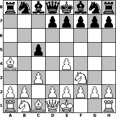 Partie-Notation im PGN-Format [Event "Trainingslager II"] [Site "www.mySchach.de"] [Date "2011.05.24"] [Round "2"] [White "UPS"] [Black "micha62"] [ECO "B00"] [WhitemyELO "1722"] [BlackmyELO "1165"] [Result "1-0"] [TimeControl "10/1728000"] [WhiteDays "19"] [BlackDays "00"] [MySchachNr "74170"] 1. e4 b5 2. Bxb5 c5 3. Nf3 a5 4. c3 a4 5. Bxa4 1-0 Stellungs-Notation im FEN-Format rnbqkbnr/3ppppp/8/2p5/B3P3/2P2N2/PP1PPPPP/RNBQK2R - KQkq - 0 5 Geschlagene Figuren Weiss: Geschlagene Figuren Schwarz: Klicken Sie auf eine geschlagene Figur um den gewünschten Zug darzustellen!