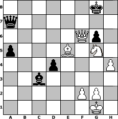 Partie-Notation im PGN-Format [Event "Albspiele 18"] [Site "www.mySchach.de"] [Date "2012.01.27"] [Round "1"] [White "Knight"] [Black "Seneca"] [ECO "C41"] [WhitemyELO "1240"] [BlackmyELO "1393"] [Result "1-0"] [TimeControl "10/1728000"] [WhiteDays "20"] [BlackDays "13"] [MySchachNr "79436"] 1. e4 e5 2. Nf3 d6 3. Nc3 Nf6 4. d3 c6 5. Be2 g6 6. O-O Bg7 7. Bg5 O-O 8. Re1 Qb6 9. b3 Ng4 10. Rf1 a6 11. a4 Re8 12. h3 Nf6 13. Re1 Nbd7 14. a5 Qc7 15. b4 b6 16. axb6 Qxb6 17. Rb1 Qc7 18. d4 exd4 19. Nxd4 Ne5 20. Na2 Nxe4 21. Bf4 Nf6 22. c4 Bd7 23. c5 dxc5 24. bxc5 Nd5 25. Bg3 Qa7 26. Nb3 Be6 27. Bf1 Bf5 28. Rc1 Nd7 29. Rxe8+ Rxe8 30. Bc4 Nxc5 31. Bxd5 cxd5 32. Nxc5 Be6 33. Nxe6 fxe6 34. Nb4 Qb6 35. Rb1 Qb5 36. Nd3 Qc4 37. Rb7 a5 38. Ne5 Qe4 39. Nf3 Bc3 40. Ng5 Qf5 41. Qc1 d4 42. Rxh7 e5 43. h4 Qf6 44. Ra7 Qb6 45. Rf7 Rf8 46. Rxf8+ Kxf8 47. Bxe5 Kg8 48. Qf4 Qa7 49. Qf6 1-0 Stellungs-Notation im FEN-Format 6k1/q7/5Qp1/p3B1N1/3p3P/2b5/5PP1/6K1 - - - 4 49 Geschlagene Figuren Weiss: Geschlagene Figuren Schwarz: Klicken Sie auf eine geschlagene Figur um den gewünschten Zug darzustellen!