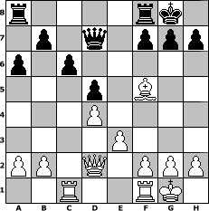 Partie-Notation im PGN-Format [Event "Die letzten Sommertage!!!"] [Site "www.mySchach.de"] [Date "2009.09.12"] [Round "1"] [White "Steffi"] [Black "Andylein1989"] [ECO "D35"] [WhitemyELO "1535"] [BlackmyELO "1549"] [Result "1/2-1/2"] [TimeControl "10/864000"] [WhiteDays "17"] [BlackDays "17"] [MySchachNr "58965"] 1. d4 d5 2. c4 e6 3. Nc3 Nf6 4. cxd5 Nxd5 5. Nf3 Bb4 6. Bd2 O-O 7. Nxd5 Bxd2+ 8. Qxd2 exd5 9. e3 c6 10. Bd3 Bg4 11. Ne5 Be6 12. O-O Nd7 13. Nxd7 Qxd7 14. Rac1 a6 15. Bb1 Bf5 16. Bxf5 1/2-1/2 Stellungs-Notation im FEN-Format r4rk1/1p1q1ppp/p1p5/3p1B2/3P4/4P3/PP1Q1PPP/2R2RK1 - - - 0 16 Geschlagene Figuren Weiss: Geschlagene Figuren Schwarz: Klicken Sie auf eine geschlagene Figur um den gewünschten Zug darzustellen!
