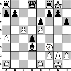 Partie-Notation im PGN-Format [Event "Obs stürmt oder schneit,zum Schach sind wir berei"] [Site "www.mySchach.de"] [Date "2017.11.16"] [Round "1"] [White "Knight"] [Black "Rabenvogel"] [ECO "D00"] [WhitemyELO "1147"] [BlackmyELO "1550"] [Result "0-1"] [TimeControl "10/1728000"] [WhiteDays "20"] [BlackDays "20"] [MySchachNr "110368"] 1. d4 d5 2. e4 c6 3. Nc3 e6 4. e5 Bb4 5. Bd2 Bxc3 6. Bxc3 Ne7 7. Nf3 h6 8. Bd3 O-O 9. O-O Nd7 10. Re1 c5 11. Bd2 Nc6 12. dxc5 Nxc5 13. Bb4 Nxb4 14. a3 Nbxd3 15. cxd3 Bd7 16. b4 Ba4 17. Qc2 Bxc2 18. bxc5 d4 19. a4 Bxd3 0-1 Stellungs-Notation im FEN-Format r2q1rk1/pp3pp1/4p2p/2P1P3/P2p4/3b1N2/5PPP/R3R1K1 - - - 0 20 Geschlagene Figuren Weiss: Geschlagene Figuren Schwarz: Klicken Sie auf eine geschlagene Figur um den gewünschten Zug darzustellen!
