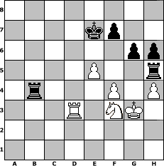 Partie-Notation im PGN-Format [Event "Der Weihnachtsmann kommt bald."] [Site "www.mySchach.de"] [Date "2010.11.05"] [Round "1"] [White "muetoe"] [Black "Erich"] [ECO "C78"] [WhitemyELO "1827"] [BlackmyELO "1954"] [Result "1/2-1/2"] [TimeControl "10/1728000"] [WhiteDays "079"] [BlackDays "120"] [MySchachNr "69544"] 1. e4 e5 2. Nf3 Nc6 3. Bb5 a6 4. Ba4 Nf6 5. O-O b5 6. Bb3 Bb7 7. Re1 Bc5 8. c3 d6 9. d4 Bb6 10. Be3 O-O 11. Nbd2 h6 12. h3 exd4 13. cxd4 Na5 14. d5 c6 15. dxc6 Nxc6 16. Qe2 Re8 17. a4 Na5 18. Bc2 Rc8 19. Bd3 Nc4 20. Bxb6 Qxb6 21. axb5 axb5 22. h4 d5 23. e5 Nh5 24. Bxc4 dxc4 25. Qe3 Qxe3 26. Rxe3 Nf4 27. Ra5 b4 28. g3 Bxf3 29. gxf4 c3 30. bxc3 bxc3 31. Nxf3 c2 32. Re1 c1=Q 33. Rxc1 Rxc1+ 34. Kg2 Rc4 35. Kg3 Rb8 36. Ra3 Rbb4 37. f5 Rg4+ 38. Kh3 Kh7 39. Rd3 Rgf4 40. Kg3 Rxf5 41. Nd4 Rh5 42. f4 Rb1 43. Nf3 g6 44. Rd7 Kg8 45. Rd8+ Kg7 46. Rd7 Kf8 47. Rd8+ Ke7 48. Rd3 Rc1 49. Rb3 Rc4 50. Rd3 Rb4 1/2-1/2 Stellungs-Notation im FEN-Format 8/4kp2/6pp/4P2r/1r3P1P/3R1NK1/8/8 - - - 14 51 Geschlagene Figuren Weiss: Geschlagene Figuren Schwarz: Klicken Sie auf eine geschlagene Figur um den gewünschten Zug darzustellen!