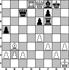 Partie-Notation im PGN-Format [Event "> 1500"] [Site "www.mySchach.de"] [Date "2010.03.18"] [Round "1"] [White "Andylein1989"] [Black "Whiskey40"] [ECO "B01"] [WhitemyELO "1503"] [BlackmyELO "1445"] [Result "1-0"] [TimeControl "10/2592000"] [WhiteDays "068"] [BlackDays "112"] [MySchachNr "64057"] 1. e4 d5 2. exd5 Qxd5 3. Nc3 Qe5+ 4. Be2 c5 5. Nf3 Qd6 6. O-O Nf6 7. Bc4 e6 8. d3 h6 9. h3 a6 10. Re1 Be7 11. Be3 Nc6 12. Nd2 b5 13. Bb3 Bb7 14. Nce4 Nxe4 15. Nxe4 Qc7 16. Bxc5 Nd4 17. Bxd4 Qc6 18. Qg4 Bc8 19. Qxg7 Rf8 20. Qxh6 Rg8 21. Bf6 Rg6 22. Qh8+ Bf8 23. Re3 Bb7 24. f3 Kd7 25. Qh7 Ke8 26. Kh2 Qc7+ 27. Kh1 Bxe4 28. dxe4 Rxf6 29. Rd1 Rd8 30. Red3 Rxd3 31. Rxd3 a5 32. Qh4 Bg7 33. Qg5 Kf8 34. Qxb5 Kg8 35. Qe8+ Bf8 36. Rd8 1-0 Stellungs-Notation im FEN-Format 3RQbk1/2q2p2/4pr2/p7/4P3/1B3P1P/PPP3P1/7K - - - 4 36 Geschlagene Figuren Weiss: Geschlagene Figuren Schwarz: Klicken Sie auf eine geschlagene Figur um den gewünschten Zug darzustellen!