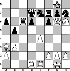 Partie-Notation im PGN-Format [Event "Sweety Tunier"] [Site "www.mySchach.de"] [Date "2006.02.28"] [Round "2"] [White "Robur"] [Black "AlbertoAveiro"] [ECO "B50"] [WhitemyELO "1721"] [BlackmyELO "1517"] [Result "1-0"] [TimeControl "10/2592000"] [WhiteDays "47"] [BlackDays "29"] [MySchachNr "23036"] 1. e4 c5 2. Nf3 d6 3. c3 Nf6 4. Bb5+ Bd7 5. Bxd7+ Nbxd7 6. d3 e6 7. O-O Be7 8. Re1 O-O 9. Na3 a6 10. Nc2 h6 11. b3 b5 12. Qe2 e5 13. Ne3 Nb6 14. Nf5 Nh7 15. d4 exd4 16. Nxe7+ Qxe7 17. cxd4 cxd4 18. Nxd4 Rac8 19. Nf5 Qe6 20. Bb2 f6 21. Qg4 Qd7 22. Nxh6+ Kh8 23. Nf5 Rf7 24. Rad1 Rc6 25. Ba3 Nc8 26. Qh5 Kg8 27. Qg6 Ne7 28. Nh6+ 1-0 Stellungs-Notation im FEN-Format 6k1/3qnrpn/p1rp1pQN/1p6/4P3/BP6/P4PPP/3RR1K1 - - - 12 28 Geschlagene Figuren Weiss: Geschlagene Figuren Schwarz: Klicken Sie auf eine geschlagene Figur um den gewünschten Zug darzustellen!