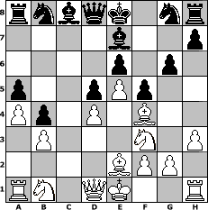 Partie-Notation im PGN-Format [Event "Schach Master"] [Site "www.mySchach.de"] [Date "2004.07.16"] [Round "1"] [White "Jonas84"] [Black "chiha"] [ECO "B10"] [WhitemyELO "1385"] [BlackmyELO "1422"] [Result "1-0"] [TimeControl "10/864000"] [WhiteDays "17"] [BlackDays "00"] [MySchachNr "5707"] 1. e4 c6 2. Nf3 d5 3. e5 f5 4. d4 e6 5. Bf4 g6 6. a3 b5 7. b3 a6 8. c4 b4 9. a4 Be7 10. Be2 a5 11. cxd5 cxd5 12. h3 1-0 Stellungs-Notation im FEN-Format rnbqk1nr/4b2p/4p1p1/p2pPp2/Pp1P1B2/1P3N1P/4BPP1/RN1QK2R - KQkq - 0 12 Geschlagene Figuren Weiss: Geschlagene Figuren Schwarz: Klicken Sie auf eine geschlagene Figur um den gewünschten Zug darzustellen!
