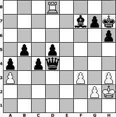 Partie-Notation im PGN-Format [Event "Neujahrstunier"] [Site "www.mySchach.de"] [Date "2010.12.23"] [Round "1"] [White "lasker"] [Black "Seneca"] [ECO "D10"] [WhitemyELO "1227"] [BlackmyELO "1538"] [Result "0-1"] [TimeControl "10/2592000"] [WhiteDays "066"] [BlackDays "153"] [MySchachNr "70753"] 1. d4 d5 2. c4 c6 3. Nc3 e6 4. Nf3 dxc4 5. e4 b5 6. Bg5 Be7 7. Bxe7 Nxe7 8. a3 O-O 9. Be2 a5 10. O-O a4 11. h3 Ng6 12. Rc1 Nf4 13. Qd2 Nxe2+ 14. Nxe2 Nd7 15. Rfe1 Nf6 16. Nc3 h6 17. Kh1 Rb8 18. Kg1 Qc7 19. Kh1 Bb7 20. Qe3 Nh7 21. Kg1 Rfe8 22. Kh1 Rbd8 23. Kg1 Nf6 24. e5 Nd5 25. Nxd5 exd5 26. Qc3 Re6 27. Qb4 Bc8 28. Kf1 Rg6 29. Qd2 Re6 30. Qc3 Ree8 31. Qd2 Bf5 32. Nh4 Bd3+ 33. Kg1 Qe7 34. Nf3 Qe6 35. Re3 Qg6 36. Ne1 Be4 37. Qe2 Rc8 38. Qg4 Qh7 39. Qe2 Re6 40. Rg3 c5 41. dxc5 Rxe5 42. Re3 f6 43. f3 Bg6 44. Rxe5 fxe5 45. Qxe5 Bf7 46. Qd6 Qf5 47. Nc2 Qe6 48. Nd4 Qe3+ 49. Kh2 Qxc1 50. c6 Qxb2 51. c7 Qxd4 52. Qd8+ Rxd8 53. cxd8=Q+ Kh7 0-1 Stellungs-Notation im FEN-Format 3R4/5bpk/7p/1p1p4/p1pq4/P4P1P/6PK/8 - - - 1 54 Geschlagene Figuren Weiss: Geschlagene Figuren Schwarz: Klicken Sie auf eine geschlagene Figur um den gewünschten Zug darzustellen!