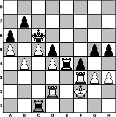 Partie-Notation im PGN-Format [Event "^^Lust, Laune und Spannung am Schach!!!^^"] [Site "www.mySchach.de"] [Date "2007.09.24"] [Round "1"] [White "Naunhofer"] [Black "Robur"] [ECO "D31"] [WhitemyELO "1646"] [BlackmyELO "1815"] [Result "0-1"] [TimeControl "10/864000"] [WhiteDays "40"] [BlackDays "06"] [MySchachNr "38461"] 1. d4 d5 2. c4 e6 3. Nc3 c6 4. e3 f5 5. cxd5 cxd5 6. Nf3 Nf6 7. Bb5+ Bd7 8. Qa4 Ne4 9. Ne5 a6 10. Bxd7+ Nxd7 11. Qxd7+ Qxd7 12. Nxd7 Kxd7 13. Na4 Bb4+ 14. Ke2 Kd6 15. f3 Nf6 16. a3 Ba5 17. b4 Bc7 18. Nc5 Rab8 19. a4 Nd7 20. a5 Nxc5 21. dxc5+ Kc6 22. Bb2 Rhg8 23. Kd3 g6 24. g3 Rbe8 25. Rab1 e5 26. Rbd1 e4+ 27. Ke2 exf3+ 28. Kxf3 Re4 29. Bd4 Rge8 30. h3 h5 31. Rd2 Be5 32. Rd3 Bxd4 33. exd4 Re2 34. Rb1 g5 35. Rbb3 Re1 36. Rd2 R8e4 37. Kf2 Rc1 38. Rf3 f4 0-1 Stellungs-Notation im FEN-Format 8/1p6/p1k5/P1Pp2pp/1P1Prp2/5RPP/3R1K2/2r5 - - - 0 39 Geschlagene Figuren Weiss: Geschlagene Figuren Schwarz: Klicken Sie auf eine geschlagene Figur um den gewünschten Zug darzustellen!
