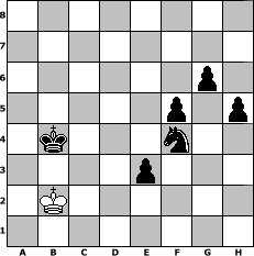 Partie-Notation im PGN-Format [Event "Unser WM-Turnier"] [Site "www.mySchach.de"] [Date "2018.07.07"] [Round "1"] [White "augustus"] [Black "Rotstift10"] [ECO "A17"] [WhitemyELO "1073"] [BlackmyELO "1625"] [Result "0-1"] [TimeControl "10/3456000"] [WhiteDays "07"] [BlackDays "38"] [MySchachNr "112565"] 1. c4 Nf6 2. Nc3 e6 3. d4 Bb4 4. e4 Nxe4 5. Qf3 f5 6. Bd2 Nxd2 7. Kxd2 Qg5+ 8. Kc2 Nc6 9. Rd1 O-O 10. Nh3 Qg6 11. Qd3 a6 12. Nf4 Qh6 13. g3 Bd6 14. Qf3 e5 15. Nfe2 e4 16. Qe3 Qxe3 17. fxe3 Nb4+ 18. Kb1 a5 19. Nf4 Bxf4 20. gxf4 c6 21. Rd2 Rf6 22. a3 Na6 23. Rg1 d6 24. Rdg2 g6 25. Be2 Be6 26. Bh5 Bf7 27. Be2 Nc7 28. h4 Kf8 29. h5 Ke7 30. d5 gxh5 31. Rh2 Rg6 32. Rxg6 hxg6 33. Na4 cxd5 34. c5 dxc5 35. Nxc5 b6 36. Nb7 Ra7 37. Nxa5 bxa5 38. a4 Ne6 39. Bb5 Be8 40. Bxe8 Kxe8 41. Rc2 Kd7 42. Rg2 Nf8 43. Ka2 Kd6 44. Ka3 Rc7 45. Rg1 Kc5 46. Rc1+ Kb6 47. Rd1 Rc5 48. b4 Rc3+ 49. Kb2 Rd3 50. bxa5+ Kxa5 51. Re1 Kxa4 52. Rc1 Rxe3 53. Rc5 Ne6 54. Rxd5 Rb3+ 55. Ka2 Nxf4 56. Rd4+ Rb4 57. Rxb4+ Kxb4 58. Kb2 e3 0-1 Stellungs-Notation im FEN-Format 8/8/6p1/5p1p/1k3n2/4p3/1K6/8 - - - 0 59 Geschlagene Figuren Weiss: Geschlagene Figuren Schwarz: Klicken Sie auf eine geschlagene Figur um den gewünschten Zug darzustellen!
