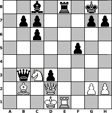 Partie-Notation im PGN-Format [Event "Hertener Schachfreunde-Jahresstart"] [Site "www.mySchach.de"] [Date "2012.02.01"] [Round "1"] [White "Sanji"] [Black "Helmut48"] [ECO "C51"] [WhitemyELO "1512"] [BlackmyELO "1868"] [Result "0-1"] [TimeControl "10/2592000"] [WhiteDays "80"] [BlackDays "89"] [MySchachNr "79546"] 1. e4 e5 2. Nf3 Nc6 3. Bc4 Bc5 4. b4 Bb6 5. a4 a6 6. a5 Ba7 7. b5 axb5 8. Bxb5 Nf6 9. Ba3 Nxe4 10. Qe2 Bxf2+ 11. Kf1 f5 12. Bxc6 dxc6 13. d3 Bd4 14. Nxd4 Qxd4 15. c3 Nxc3 16. Nxc3 Rxa5 17. Bb2 Rxa1+ 18. Bxa1 O-O 19. Bb2 e4 20. Ke1 exd3 21. Qd2 Re8+ 22. Kd1 Qc4 23. Re1 Qb3+ 0-1 Stellungs-Notation im FEN-Format 2b1r1k1/1pp3pp/2p5/5p2/8/1qNp4/1B1Q2PP/3KR3 - - - 6 24 Geschlagene Figuren Weiss: Geschlagene Figuren Schwarz: Klicken Sie auf eine geschlagene Figur um den gewünschten Zug darzustellen!