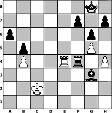 Partie-Notation im PGN-Format [Event "Wargames-kill the King II"] [Site "www.mySchach.de"] [Date "2005.11.18"] [Round "1"] [White "MichaelKnopf"] [Black "nogumo"] [ECO "A00"] [WhitemyELO "1642"] [BlackmyELO "1815"] [Result "0-1"] [TimeControl "10/864000"] [WhiteDays "10"] [BlackDays "10"] [MySchachNr "19753"] 1. g3 Nf6 2. Bg2 g6 3. Nf3 Bg7 4. O-O O-O 5. c3 c5 6. Na3 Nc6 7. h3 a6 8. g4 d6 9. d4 Rb8 10. g5 Nd7 11. dxc5 Nxc5 12. Nc2 Bd7 13. Be3 Na4 14. Bc1 Qc8 15. Ne3 Nc5 16. h4 Bh3 17. a3 Bxg2 18. Kxg2 Ne6 19. Nd5 b5 20. Nd4 Nexd4 21. cxd4 Qg4+ 22. Kh1 Qe4+ 23. Kg1 Qxd5 24. e3 Na5 25. b4 Nc4 26. f3 Rbc8 27. Ra2 e5 28. e4 Qxd4+ 29. Qxd4 exd4 30. Rd1 Rfd8 31. Bf4 Ne3 32. Bxe3 dxe3 33. Kf1 Be5 34. Ke2 Bf4 35. Rg1 Rc3 36. Rg4 Be5 37. Rg1 d5 38. exd5 Rxd5 39. Rg4 Rd2+ 40. Rxd2 exd2 41. Kxd2 Rxf3 42. Re4 Bg3 43. Kc2 Rxa3 44. Kb2 Rf3 45. Kc2 Rf4 0-1 Stellungs-Notation im FEN-Format 6k1/5p1p/p5p1/1p4P1/1P2Rr1P/6b1/2K5/8 - - - 4 46 Geschlagene Figuren Weiss: Geschlagene Figuren Schwarz: Klicken Sie auf eine geschlagene Figur um den gewünschten Zug darzustellen!