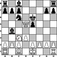 Partie-Notation im PGN-Format [Event "^^Frohes neues Jahr^^"] [Site "www.mySchach.de"] [Date "2007.12.29"] [Round "1"] [White "freizeitspieler"] [Black "bluescreenlover"] [ECO "B00"] [WhitemyELO "1570"] [BlackmyELO "1278"] [Result "1-0"] [TimeControl "10/864000"] [WhiteDays "20"] [BlackDays "20"] [MySchachNr "41061"] 1. e4 Nc6 2. Nf3 e5 3. Bc4 Nf6 4. d3 Bc5 5. Ng5 d5 6. exd5 Nxd5 7. Nxf7 Kxf7 8. Qf3+ Ke6 9. Nc3 Bb4 10. Bxd5+ Qxd5 11. Qxd5+ 1-0 Stellungs-Notation im FEN-Format r1b4r/ppp3pp/2n1k3/3Qp3/1b6/2NP4/PPP1PPPP/R1B1K2R - KQ - 0 11 Geschlagene Figuren Weiss: Geschlagene Figuren Schwarz: Klicken Sie auf eine geschlagene Figur um den gewünschten Zug darzustellen!