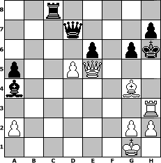 Partie-Notation im PGN-Format [Event "November-Open 1/6"] [Site "www.mySchach.de"] [Date "2007.11.05"] [Round "1"] [White "HenrySchinasky"] [Black "brucybabe"] [ECO "A16"] [WhitemyELO "1935"] [BlackmyELO "1557"] [Result "1-0"] [TimeControl "10/1728000"] [WhiteDays "19"] [BlackDays "20"] [MySchachNr "39479"] 1. c4 Nf6 2. Nc3 d5 3. d4 e6 4. Bg5 Be7 5. Nf3 O-O 6. e3 c6 7. Rc1 dxc4 8. Bxc4 Nd5 9. Bxe7 Qxe7 10. O-O Nd7 11. Qc2 N7f6 12. Be2 Re8 13. Ne5 Nxc3 14. bxc3 Nd7 15. f4 c5 16. Bd3 g6 17. e4 Nxe5 18. fxe5 cxd4 19. cxd4 Bd7 20. Rcd1 Qb4 21. Qf2 Rf8 22. Rb1 Qc3 23. Rxb7 Be8 24. Rb3 Qc7 25. Qe3 Rd8 26. Be2 a5 27. Rfb1 Ba4 28. Ra3 Qd7 29. d5 exd5 30. exd5 Rb8 31. Rc1 Rfc8 32. Rxc8+ Rxc8 33. e6 fxe6 34. Bg4 Kg7 35. Qe5+ Kh6 36. Rh3# 1-0 Stellungs-Notation im FEN-Format 2r5/3q3p/4p1pk/p2PQ3/b5B1/7R/P5PP/6K1 - - - 5 36 Geschlagene Figuren Weiss: Geschlagene Figuren Schwarz: Klicken Sie auf eine geschlagene Figur um den gewünschten Zug darzustellen!
