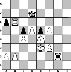 Partie-Notation im PGN-Format [Event "Einstand"] [Site "www.mySchach.de"] [Date "2010.12.10"] [Round "2"] [White "espero"] [Black "reisender"] [ECO "A40"] [WhitemyELO "1632"] [BlackmyELO "1328"] [Result "1-0"] [TimeControl "10/864000"] [WhiteDays "10"] [BlackDays "10"] [MySchachNr "70500"] 1. d4 g6 2. e4 Bg7 3. h4 d6 4. h5 Nc6 5. c3 e5 6. h6 Bf6 7. d5 Nce7 8. g4 g5 9. f3 c6 10. c4 Qa5+ 11. Nc3 Bd7 12. Be3 c5 13. Qd2 a6 14. Bxg5 Bxg5 15. Qxg5 Ng6 16. Nge2 Qd8 17. Qxd8+ Kxd8 18. Bh3 Nxh6 19. g5 Ng8 20. O-O-O h6 21. Bxd7 Kxd7 22. gxh6 Nxh6 23. Rh5 Rag8 24. Rdh1 Ke7 25. Rxh6 Rxh6 26. Rxh6 Kf6 27. Kd2 Kg7 28. Rh1 b6 29. Ke3 f6 30. Ng3 Ne7 31. Nf5+ Nxf5+ 32. exf5 Kf8 33. Rh6 Kf7 34. Ne4 Ke7 35. Rxf6 Rg2 36. Re6+ Kd7 37. Rxd6+ Kc7 38. Rc6+ Kd7 39. Rxb6 1-0 Stellungs-Notation im FEN-Format 8/3k4/pR6/2pPpP2/2P1N3/4KP2/PP4r1/8 - - - 0 39 Geschlagene Figuren Weiss: Geschlagene Figuren Schwarz: Klicken Sie auf eine geschlagene Figur um den gewünschten Zug darzustellen!