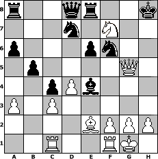 Partie-Notation im PGN-Format [Event "QGD: Orthodox Verteidigung"] [Site "www.mySchach.de"] [Date "2008.08.11"] [Round "1"] [White "andreas007"] [Black "scherry"] [ECO "D64"] [WhitemyELO "1391"] [BlackmyELO "1339"] [Result "1-0"] [TimeControl "10/2592000"] [WhiteDays "89"] [BlackDays "85"] [MySchachNr "47032"] 1. d4 d5 2. c4 e6 3. Nc3 Nf6 4. Bg5 Be7 5. e3 O-O 6. Nf3 Nbd7 7. Rc1 c6 8. Qc2 a6 9. Bd3 h6 10. Bf4 dxc4 11. Bxc4 Bb4 12. O-O b5 13. Bd3 Bb7 14. a3 Bxc3 15. bxc3 c5 16. e4 c4 17. Be2 Bxe4 18. Qd2 Re8 19. Ne5 g5 20. Bxg5 hxg5 21. Qxg5+ Kh8 22. Nxf7+ 1-0 Stellungs-Notation im FEN-Format r2qr2k/3n1N2/p3pn2/1p4Q1/2pPb3/P1P5/4BPPP/2R2RK1 - - - 0 22 Geschlagene Figuren Weiss: Geschlagene Figuren Schwarz: Klicken Sie auf eine geschlagene Figur um den gewünschten Zug darzustellen!