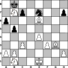 Partie-Notation im PGN-Format [Event "°°°°``Der sch"] [Site "www.mySchach.de"] [Date "2009.05.11"] [Round "1"] [White "murphy12"] [Black "Knight"] [ECO "A00"] [WhitemyELO "1580"] [BlackmyELO "1086"] [Result "1-0"] [TimeControl "10/864000"] [WhiteDays "30"] [BlackDays "27"] [MySchachNr "55589"] 1. Nc3 e5 2. f4 Nc6 3. Nf3 exf4 4. d4 g5 5. e4 g4 6. Bxf4 gxf3 7. gxf3 Bg7 8. Nb5 d6 9. Rg1 Bf6 10. c3 Be6 11. d5 a6 12. N5a3 Bd7 13. dxc6 Bxc6 14. Bh3 Ne7 15. Nc4 Bg7 16. Rxg7 b5 17. Ne3 Ng6 18. Bg3 Qf6 19. Nf5 O-O-O 20. Rxf7 Qxf7 21. Nxd6+ Kb8 22. Nxf7 Rxd1+ 23. Rxd1 Rf8 24. Be6 Ne7 25. Rd8+ Rxd8 26. Nxd8 Bb7 27. Nxb7 1-0 Stellungs-Notation im FEN-Format 1k6/1Np1n2p/p3B3/1p6/4P3/2P2PB1/PP5P/1N2K3 - - - 0 27 Geschlagene Figuren Weiss: Geschlagene Figuren Schwarz: Klicken Sie auf eine geschlagene Figur um den gewünschten Zug darzustellen!