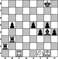 Partie-Notation im PGN-Format [Event "Eine zentrale Er"] [Site "www.mySchach.de"] [Date "2009.05.20"] [Round "2"] [White "sel"] [Black "ujack1961"] [ECO "C68"] [WhitemyELO "1325"] [BlackmyELO "1565"] [Result "0-1"] [TimeControl "10/2592000"] [WhiteDays "119"] [BlackDays "120"] [MySchachNr "55940"] 1. e4 e5 2. Nf3 Nc6 3. Bb5 a6 4. Bxc6 dxc6 5. d3 Bd6 6. Bg5 f6 7. Be3 Ne7 8. Nbd2 O-O 9. O-O Be6 10. h3 Qd7 11. g4 g5 12. Nh2 b5 13. b3 h5 14. f3 c5 15. Qe1 h4 16. Bf2 Ng6 17. Qe3 Nf4 18. Rfe1 Nxh3+ 19. Kh1 Nf4 20. Rf1 a5 21. Qe1 c6 22. Be3 a4 23. Bxf4 exf4 24. Qf2 axb3 25. cxb3 Bc7 26. Qe2 Qd4 27. Rfc1 Ba5 28. Rc2 Qxa1+ 29. Qf1 Qxf1+ 30. Nhxf1 Rfd8 31. Rxc5 Bxd2 32. Nxd2 Rxd3 33. Rxc6 Rxa2 34. Nf1 Rxf3 35. Rc1 Bxg4 36. Kg1 Rxb3 37. e5 fxe5 0-1 Stellungs-Notation im FEN-Format 6k1/8/8/1p2p1p1/5pbp/1r6/r7/2R2NK1 - - - 0 38 Geschlagene Figuren Weiss: Geschlagene Figuren Schwarz: Klicken Sie auf eine geschlagene Figur um den gewünschten Zug darzustellen!