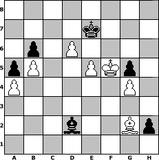 Partie-Notation im PGN-Format [Event "°°°]^^[-Wilkommen im Jahr 2009-]^^[°°°"] [Site "www.mySchach.de"] [Date "2009.01.03"] [Round "1"] [White "nogumo"] [Black "murphy12"] [ECO "A00"] [WhitemyELO "1589"] [BlackmyELO "1650"] [Result "1-0"] [TimeControl "10/864000"] [WhiteDays "27"] [BlackDays "50"] [MySchachNr "51342"] 1. b4 c6 2. c4 a5 3. b5 Nf6 4. Bb2 d5 5. e3 Bf5 6. Nf3 e6 7. Be2 Be7 8. O-O O-O 9. Nd4 Bg6 10. cxd5 cxd5 11. a4 Nbd7 12. Nc3 Rc8 13. Rc1 Qb6 14. f4 Ne4 15. f5 Nxc3 16. Bxc3 exf5 17. Nxf5 Bxf5 18. Rxf5 Nf6 19. Bxf6 Bxf6 20. Rxd5 Rfd8 21. Bf3 Rxd5 22. Rxc8+ Rd8 23. Qc2 g6 24. Rxd8+ Bxd8 25. Qc8 Qd6 26. d4 b6 27. Qc6 Be7 28. Bd5 Kg7 29. Qxd6 Bxd6 30. g3 f5 31. Kg2 Kf6 32. Kf3 g5 33. h3 h5 34. g4 fxg4+ 35. hxg4 h4 36. e4 Bb4 37. e5+ Ke7 38. Bc4 Bc3 39. Ke4 h3 40. Bf1 h2 41. Bg2 Bb2 42. d5 Bc3 43. Kf5 Bd2 44. d6+ 1-0 Stellungs-Notation im FEN-Format 8/4k3/1p1P4/pP2PKp1/P5P1/8/3b2Bp/8 - - - 0 44 Geschlagene Figuren Weiss: ![]() ![]() ![]() ![]() ![]() ![]() ![]() ![]() ![]() ![]() ![]() ![]() ![]() ![]() ![]() Geschlagene Figuren Schwarz: ![]() ![]() ![]() ![]() ![]() ![]() ![]() ![]() ![]() ![]() ![]() ![]() ![]() ![]() ![]() Klicken Sie auf eine geschlagene Figur um den gewünschten Zug darzustellen!