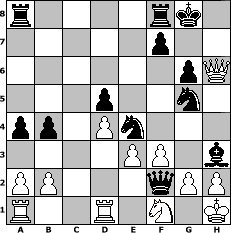 Partie-Notation im PGN-Format [Event "MNX1"] [Site "www.mySchach.de"] [Date "2015.03.13"] [Round "1"] [White "kalle"] [Black "muetoe"] [ECO "D31"] [WhitemyELO "1603"] [BlackmyELO "1780"] [Result "0-1"] [TimeControl "10/2592000"] [WhiteDays "30"] [BlackDays "30"] [MySchachNr "98521"] 1. d4 d5 2. c4 e6 3. Nc3 a6 4. cxd5 exd5 5. Bf4 Nf6 6. e3 Bd6 7. Bxd6 Qxd6 8. Bd3 O-O 9. Nge2 b5 10. Nf4 Nbd7 11. Qf3 Bb7 12. O-O c5 13. Nfe2 c4 14. Bc2 b4 15. Nb1 a5 16. Nd2 a4 17. Nxc4 Qc7 18. Bxh7+ Nxh7 19. Nd2 Qc2 20. Rfd1 Ndf6 21. Nf1 Ng5 22. Qg3 Nfe4 23. Qg4 Bc8 24. Qh5 g6 25. Qh6 Qxe2 26. f3 Qf2+ 27. Kh1 Bh3 0-1 Stellungs-Notation im FEN-Format r4rk1/5p2/6pQ/3p2n1/pp1Pn3/4PP1b/PP3qPP/R2R1N1K - - - 3 28 Geschlagene Figuren Weiss: Geschlagene Figuren Schwarz: Klicken Sie auf eine geschlagene Figur um den gewünschten Zug darzustellen!
