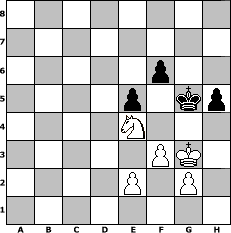 Partie-Notation im PGN-Format [Event "M"] [Site "www.mySchach.de"] [Date "2014.05.10"] [Round "1"] [White "kalle"] [Black "alibengali"] [ECO "C90"] [WhitemyELO "1566"] [BlackmyELO "1647"] [Result "1-0"] [TimeControl "10/3456000"] [WhiteDays "35"] [BlackDays "39"] [MySchachNr "94371"] 1. e4 e5 2. Nf3 Nc6 3. Bb5 a6 4. Ba4 Nf6 5. O-O Be7 6. Re1 b5 7. Bb3 d6 8. h3 Na5 9. c3 Nxb3 10. axb3 Bb7 11. d3 O-O 12. Nbd2 c5 13. Nf1 b4 14. Ne3 Re8 15. Nf5 h6 16. N3h4 d5 17. Nxe7+ Qxe7 18. Nf5 Qe6 19. Ng3 a5 20. d4 dxe4 21. dxc5 Red8 22. Qc2 bxc3 23. Qxc3 Rd3 24. Qc2 Qxb3 25. Qxb3 Rxb3 26. Bd2 Rxb2 27. Bxa5 Rb5 28. Bb6 Rxa1 29. Rxa1 Nd7 30. Ra7 Rb1+ 31. Kh2 Bc6 32. Rc7 Ba4 33. Nxe4 Nxb6 34. Rb7 Bc6 35. Rb8+ Kh7 36. Nd6 f6 37. Rxb6 Rxb6 38. cxb6 Kg6 39. b7 Bxb7 40. Nxb7 Kg5 41. Kg3 g6 42. Nd6 h5 43. h4+ Kh6 44. f3 g5 45. hxg5+ Kxg5 46. Ne4+ 1-0 Stellungs-Notation im FEN-Format 8/8/5p2/4p1kp/4N3/5PK1/4P1P1/8 - - - 1 46 Geschlagene Figuren Weiss: Geschlagene Figuren Schwarz: Klicken Sie auf eine geschlagene Figur um den gewünschten Zug darzustellen!