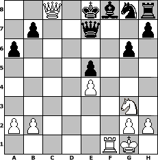 Partie-Notation im PGN-Format [Event "Wrixum - Open die XII"] [Site "www.mySchach.de"] [Date "2014.10.09"] [Round "1"] [White "pepo47"] [Black "UPS"] [ECO "B30"] [WhitemyELO "2068"] [BlackmyELO "1650"] [Result "1-0"] [TimeControl "10/2592000"] [WhiteDays "90"] [BlackDays "60"] [MySchachNr "96273"] 1. e4 c5 2. Nf3 Nc6 3. Bb5 Qc7 4. Nc3 e6 5. O-O Nd4 6. Nxd4 cxd4 7. Ne2 a6 8. Bd3 e5 9. c3 dxc3 10. Ng3 cxd2 11. Bxd2 d6 12. Rc1 Qd8 13. Bc4 g6 14. Qb3 Qe7 15. f4 Be6 16. Bxe6 fxe6 17. fxe5 dxe5 18. Bb4 Qxb4 19. Qxe6+ Qe7 20. Rc8+ Rxc8 21. Qxc8+ 1-0 Stellungs-Notation im FEN-Format 2Q1kbnr/1p2q2p/p5p1/4p3/4P3/6N1/PP4PP/5RK1 - k - 0 21 Geschlagene Figuren Weiss: ![]() ![]() ![]() ![]() ![]() ![]() ![]() ![]() ![]() ![]() ![]() ![]() ![]() ![]() ![]() Geschlagene Figuren Schwarz: ![]() ![]() ![]() ![]() ![]() ![]() ![]() ![]() ![]() ![]() ![]() ![]() ![]() ![]() ![]() Klicken Sie auf eine geschlagene Figur um den gewünschten Zug darzustellen!