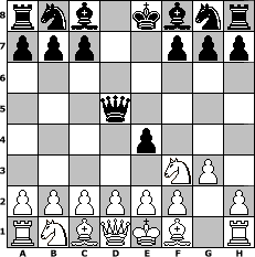 Partie-Notation im PGN-Format [Event "6. Wikinger-Klubmeisterschaft (Finale)"] [Site "www.mySchach.de"] [Date "2010.09.19"] [Round "1"] [White "mizuho"] [Black "werderfan"] [ECO "A20"] [WhitemyELO "1577"] [BlackmyELO "1528"] [Result "0-1"] [TimeControl "10/2592000"] [WhiteDays "06"] [BlackDays "30"] [MySchachNr "68460"] 1. c4 e5 2. g3 d5 3. cxd5 Qxd5 4. Nf3 e4 0-1 Stellungs-Notation im FEN-Format rnb1kbnr/ppp2ppp/8/3q4/4p3/5NP1/PPPPPP1P/RNBQKB1R - KQkq - 0 5 Geschlagene Figuren Weiss: ![]() ![]() ![]() ![]() ![]() ![]() ![]() ![]() ![]() ![]() ![]() ![]() ![]() ![]() ![]() Geschlagene Figuren Schwarz: ![]() ![]() ![]() ![]() ![]() ![]() ![]() ![]() ![]() ![]() ![]() ![]() ![]() ![]() ![]() Klicken Sie auf eine geschlagene Figur um den gewünschten Zug darzustellen!